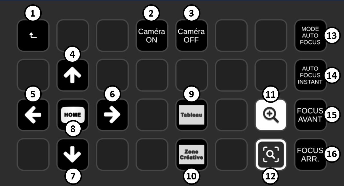 | 9 | Tableau | Dirige la caméra vers le tableau blanc + rétabli le zoom pour cette zone. |