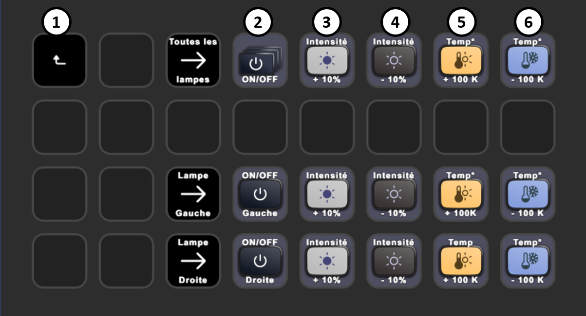 La première ligne correspond au contrôle de toutes les lampes du studio. Les autres lignes correspondent au contrôle des lampes indépendamment les unes des autres.