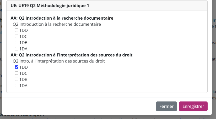 La liste des UE du cursus et du bloc sélectionné va s'afficher, vous pouvez maintenant cocher les groupes dans lesquels vous êtes inscrit(e) pour chaque UE. Vos groupes vous sont communiqués en début d'année académique. Pour plus d'informations au sujet de vos groupes de cours, contactez le secrétariat ou l'horairiste de votre campus. - Une fois tous vos groupes sélectionnez, cliquez sur le bouton "Enregistrer" tout en bas de la liste. Vous pourrez revenir consulter et modifier cette liste plus tard si nécéssaire.