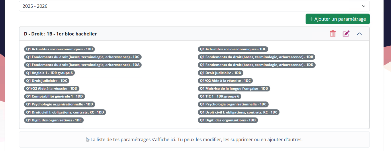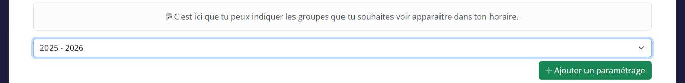 - Dans la première liste déroulante de l'écran, sélectionnez l'année académique que vous souhaitez paramétrer puis cliquez sur le bouton vert "+ Ajouter un paramétrage".