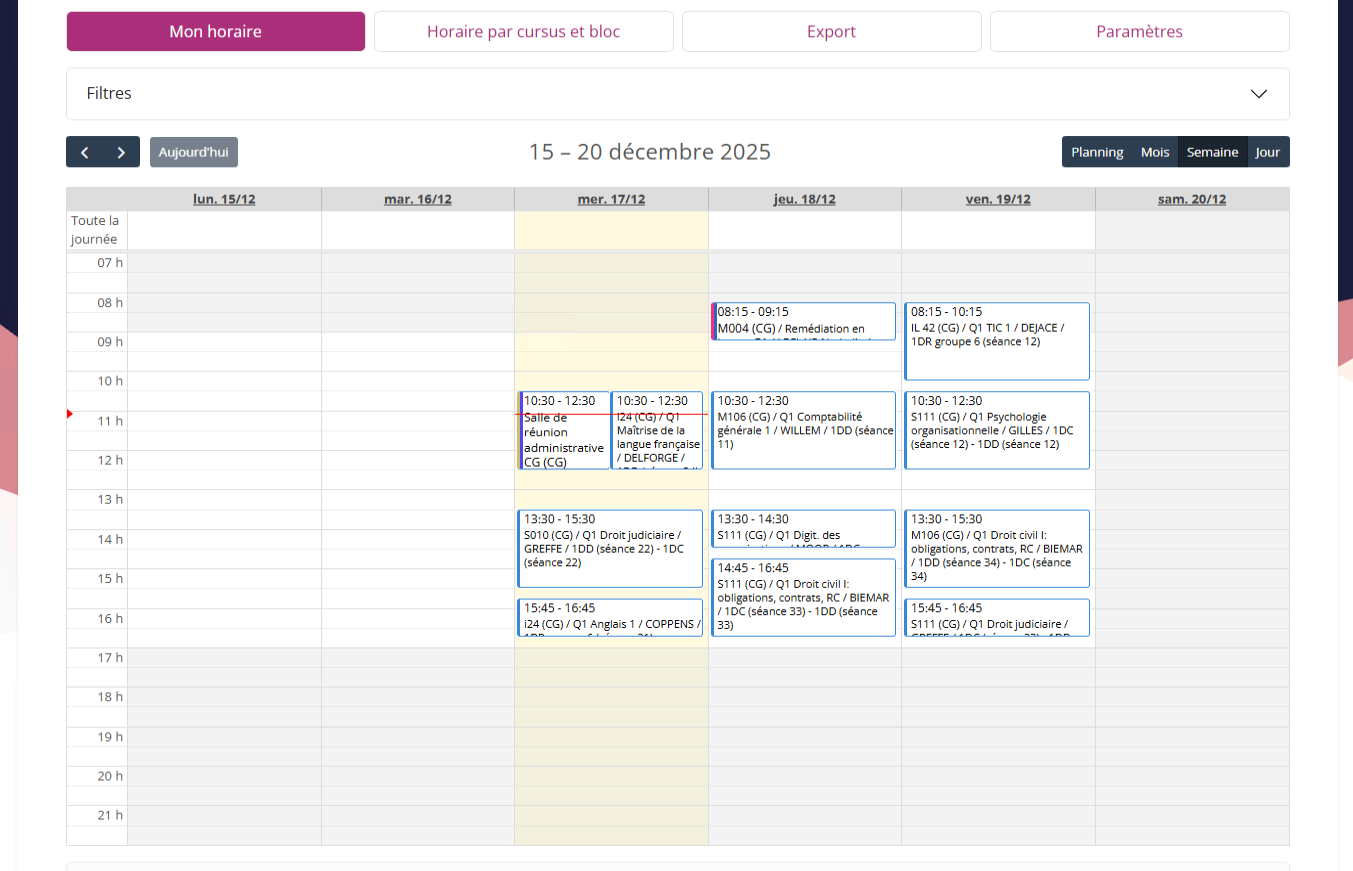 Attention : Les nouvelles inscriptions et les réorientations sont prises en compte dans votre horaire 24h après leur encodage par le secrétariat académique. Merci de faire preuve de patience pendant ce délai. Si le problème persiste une fois ce délai passé, vérifiez votre dossier administratif auprès du secrétariat de votre institut. -
