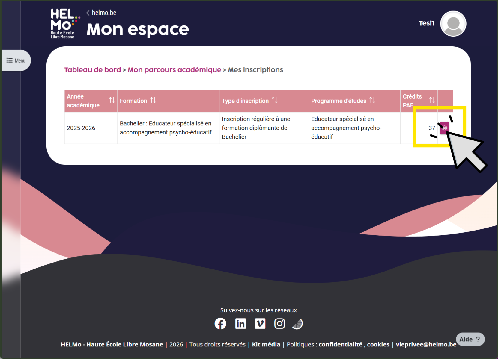 1. Rends toi sur http://mon-espace.helmo.be et sélectionne le module "Mon parcours académique" :