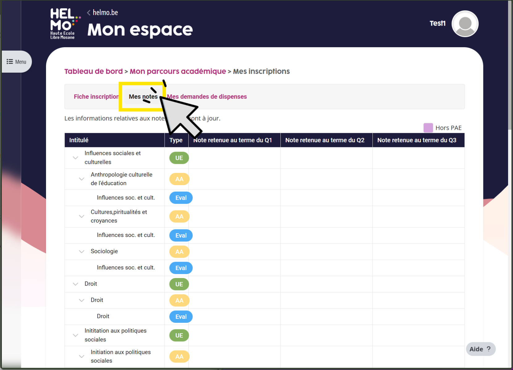 4. Clique sur l'onglet "Mes notes". C'est là qu'apparaitront tes résultats lorsqu'ils seront disponibles :
